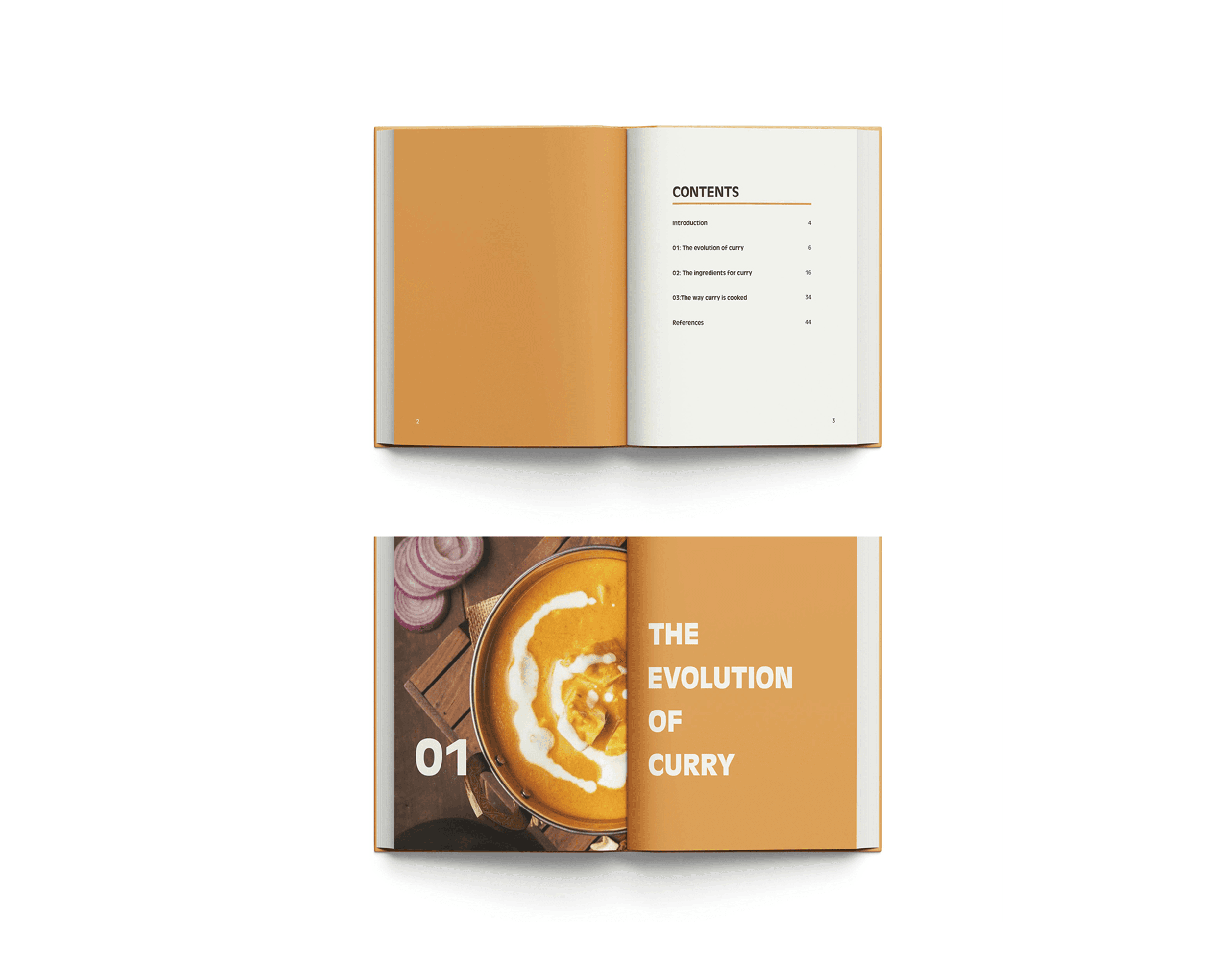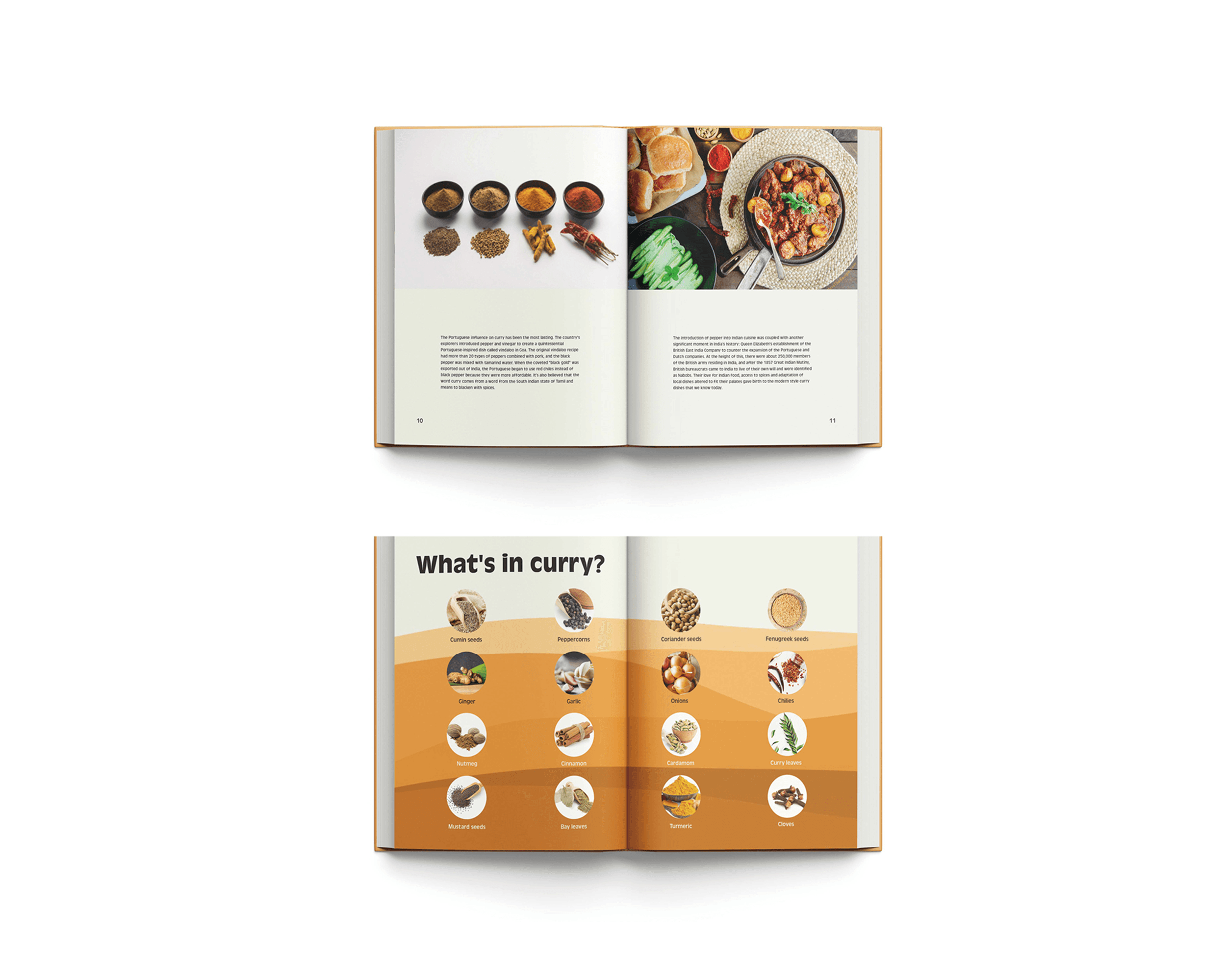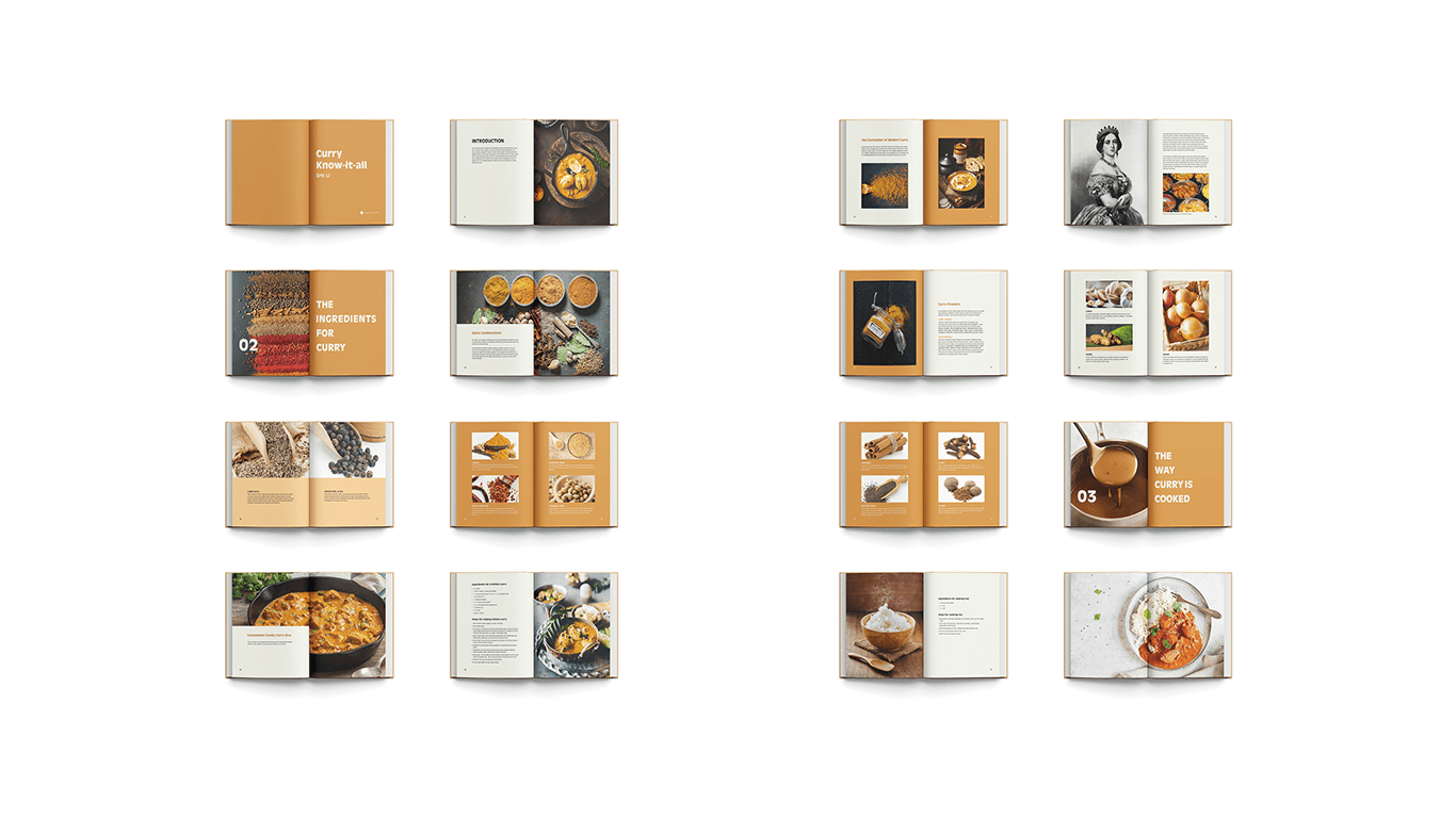 I developed a layered visual system using warm, spice-inspired color gradients and structured typography to guide readers through the recipes and origins of curry. The book’s print and digital versions share a consistent design language that emphasizes warmth, flavor, and discovery.